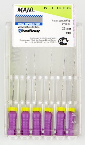 К-файл №10 Mani – ручной эндодонтический инструмент с универсальными свойствами. Он используется для прохождения зубных каналов с целью их очистки и расширения. Гибкость и длина в 25 мм позволяет использовать их для сильно искривленных профилей.